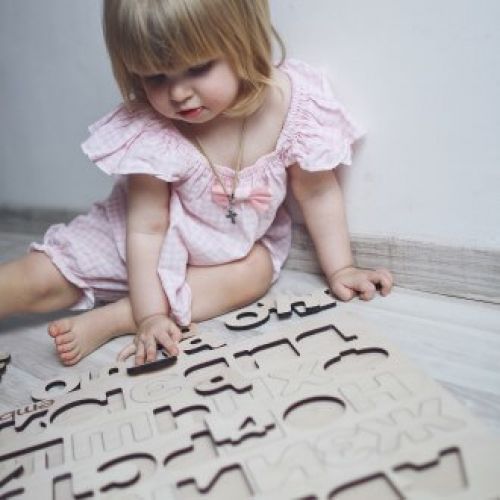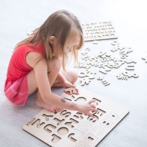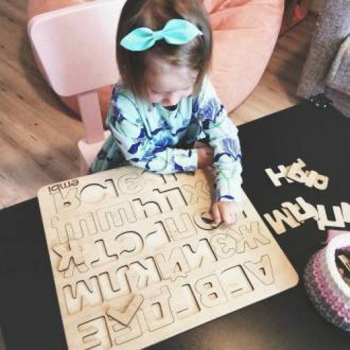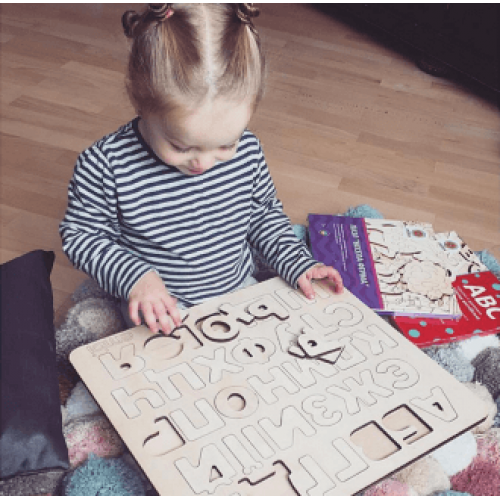 Виріб у вигляді пазлів-вкладок українського, російського або англійського алфавіту. Абетку можна розфарбувати, скласти слова, вставляти і витягати літери, вчити абетку, грати на піску або робити декупаж. Розвиває моторику і уяву.