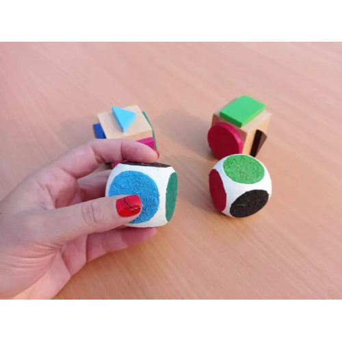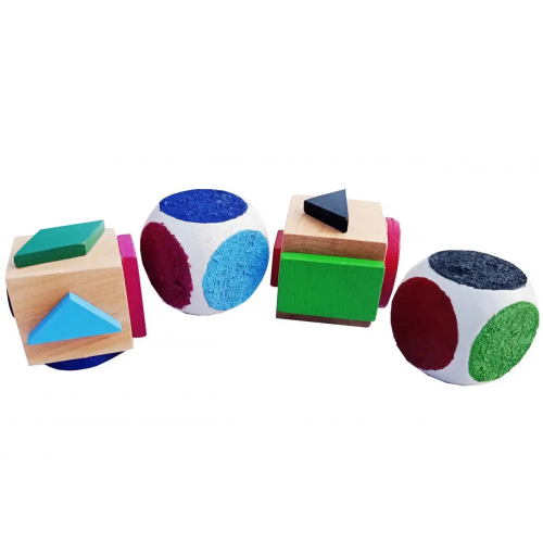 Кубик геометричні фігури на кожній стороні має об’ємну геометричну фігуру. Колір фігури співпадає з кольором на кубиках кольори. Таким чином, до кожного кольору є одна геометрична фігура саме такого кольору.