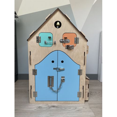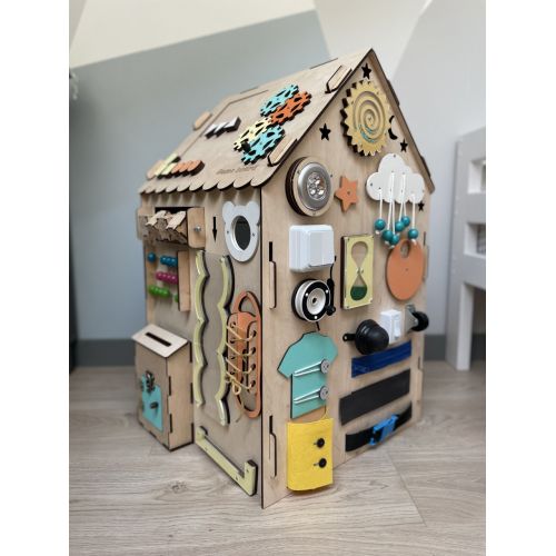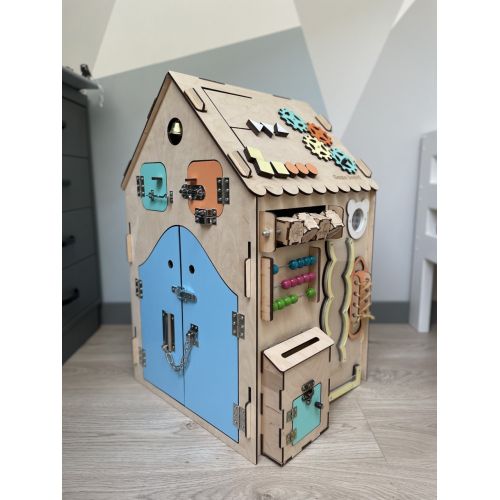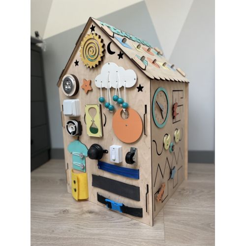 Виріб у вигляді яскравого будиночка. Має 6 сторін і можливе різноманітне наповнення. З надійно зафіксованими деталями. Всі елементи абсолютно безпечні для маленьких дітей. Варіанти кольорів будиночка для хлопчиків і дівчаток на вибір. Додатково можна додати ім'я дитини за бажанням. Одночасно кілька діток можуть користуватися багатофункціональною іграшкою. А також дитина може залізати в бізіхаус.