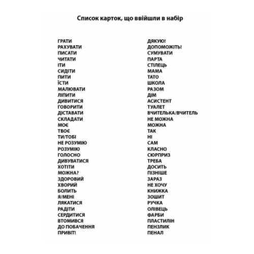 Картки візуальної підтримки процесу навчання для індивідуальних занять допоможуть в організації навчання дітям з особливим розвитком інтелекту, розладом спектра аутизму та мовленнєвим порушенням. Для таких дітей візуальне сприймання дається краще і легше ніж сприймання інформації на слух. Їм легше втримати і зрозуміти інформацію за допомогою карток.