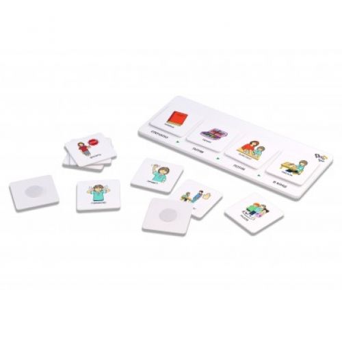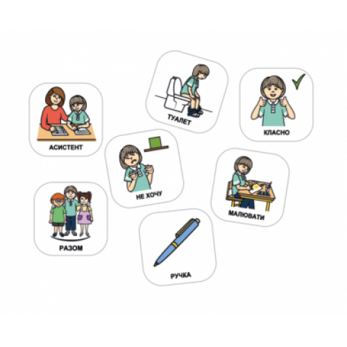 Великі картинки на білому фоні полегшують процес навчання, роблять учбовий день зрозумілим та послідовним. Картки можна закріпити магнітами або кнопками на дошці.