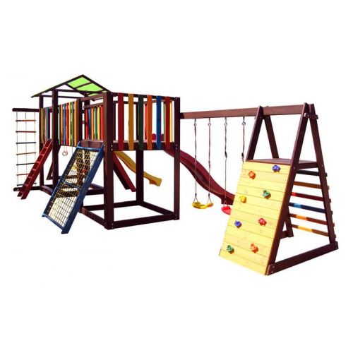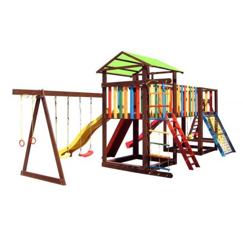 У комплекті: ігровий будиночок, пісочниця, 2 скелелазки, сітка, місток, 2 гірки, 2 гойдалки, кільця, піратська драбинка. З тентовим дахом.