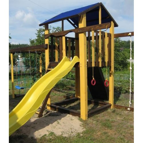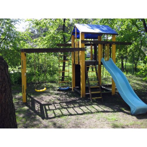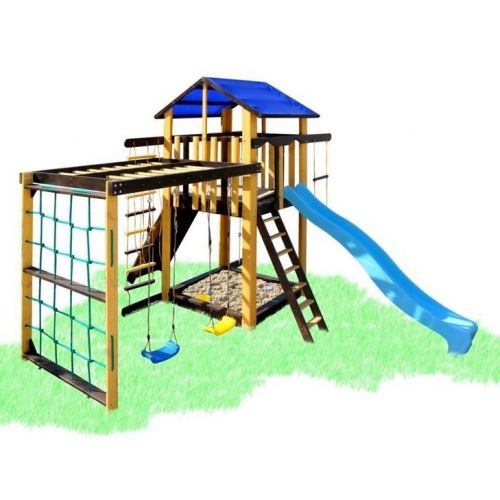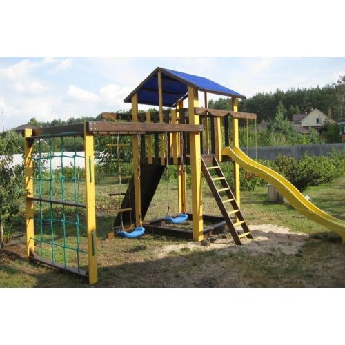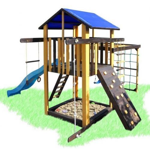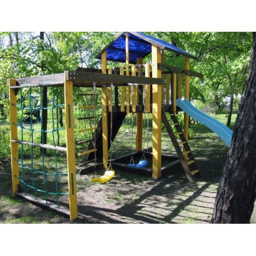 У комплекті: ігровий будиночок, пісочниця, скелелазка, сітка, рукохід берізка, гірка, 2 гойдалки, кільця, канат, піратська драбинка. З тентовим дахом.