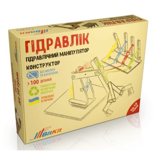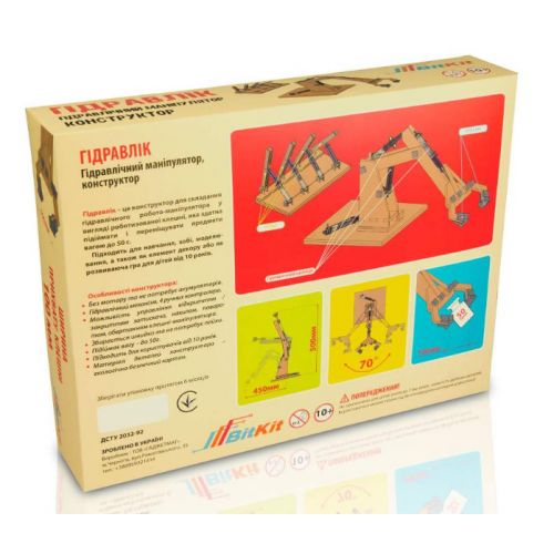 Виріб має гідравлічний механізм і ручні контролери. Не потребує паяння. Конструктор без моторів і батарейок.