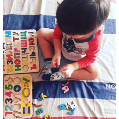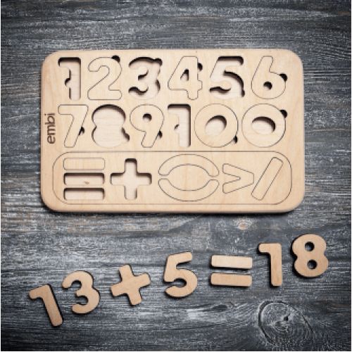 Виріб у вигляді пазлів-вкладок цифр і математичних символів. Пазли можна розфарбувати, скласти числа, вставляти на місце і витягати, вчити числа, додавати, множити, грати на піску або робити декупаж. Розвиває моторику і пам'ять.