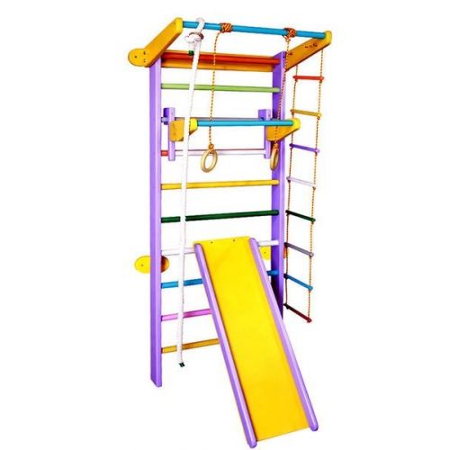 У комплекті: шведська стінка, турнік, мотузковий набір, дитячий турнік, дошка-гірка і кріплення.