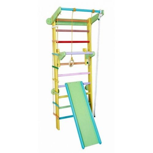 У комплекті: шведська стінка, турнік, мотузковий набір, дитячий турнік, гірка і кріплення.