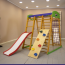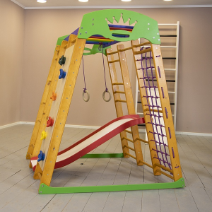 Спортивно-ігровий куточок містить рукохід, сходинки, гімнастичні кільця, гірку, шведська стінку та скелелазку. Не вимагає кріплення.