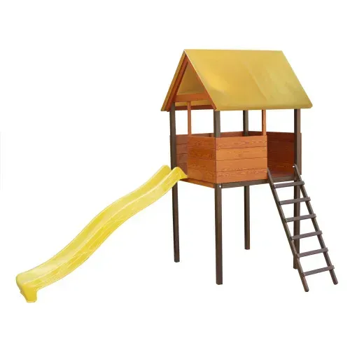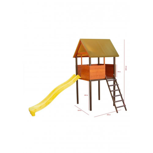 Компактний і функціональний ігровий комплекс. Виготовлений із масиву сосни, має двосхилий дах для захисту від сонця та дощу. До складу входить зручна гірка довжиною 3 м з високими бортиками для безпеки. Під будиночком можна облаштувати пісочницю, зону для творчості або чаювання. Ідеальне рішення для активних ігор на свіжому повітрі, яке розвиває уяву та фізичну активність дитини.