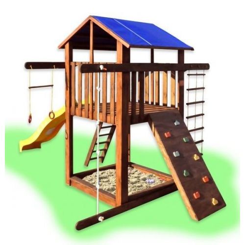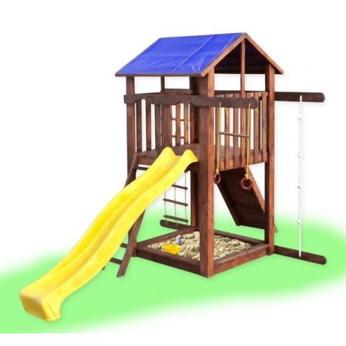 У комплекті: ігровий будиночок, пісочниця, скелелазка, гірка, кільця, канат, піратська драбинка. З тентовим дахом. Виріб надійний, яскравий і довговічний. Покритий антисептиком і абсолютно безпечний для маленьких дітей.
