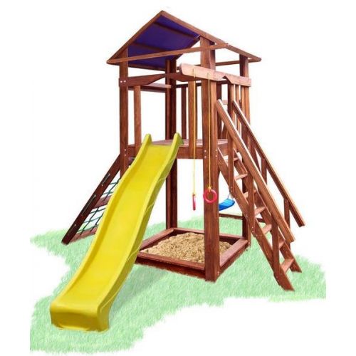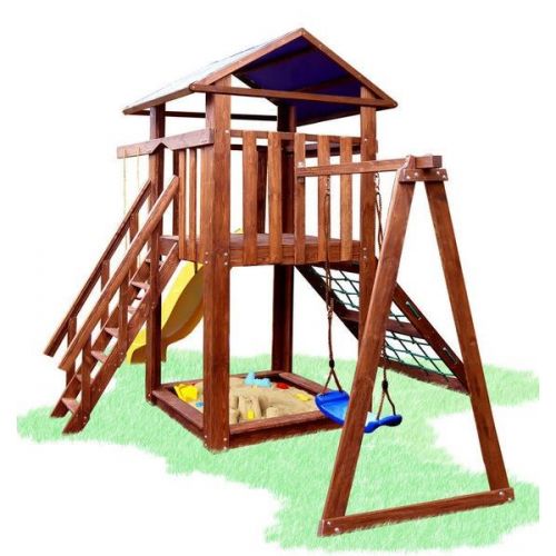 У комплекті: ігровий будиночок, пісочниця з кришкою, сітка, гірка, гойдалка, кільця. З тентовим дахом. Виріб надійний, яскравий і довговічний. Покритий антисептиком і абсолютно безпечний для маленьких дітей.