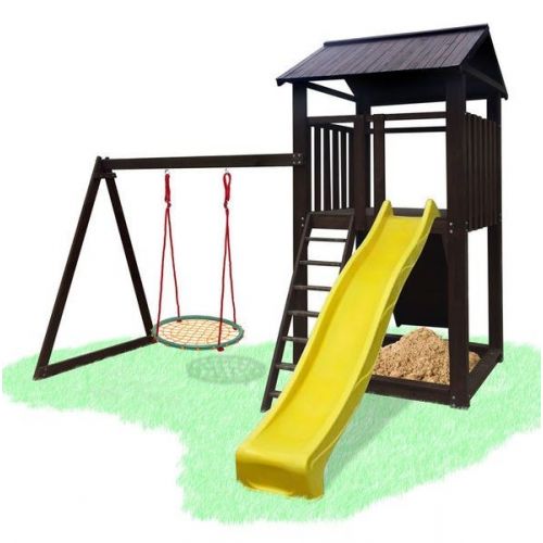 У комплекті: ігровий будиночок, пісочниця, скелелазка, гірка, гойдалка гніздо лелеки. З дерев'яним дахом.