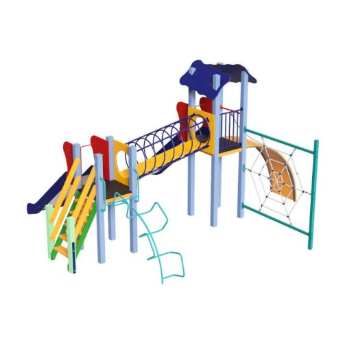 Виріб у вигляді яскравого спортивно-ігрового комплексу. З оригінальним дизайном, 2 гірками, східцями, мостиком, спортивною зоною. Для дітей від 5 років.