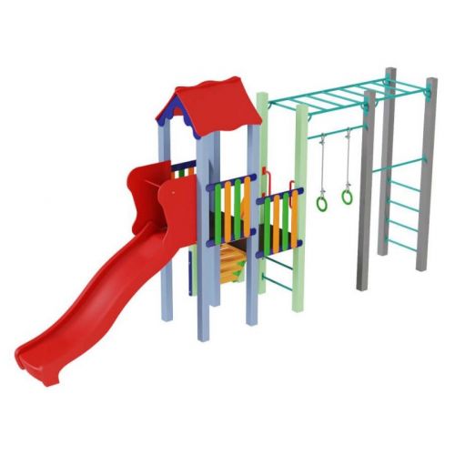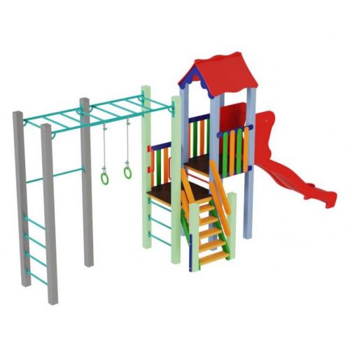 Виріб у вигляді яскравого спортивно-ігрового комплексу. З оригінальним дизайном, вежею, дахом, гіркою, сходами, 2 платформами, турніком, рукоходом, шведською стінкою. Для дітей від 5 років.