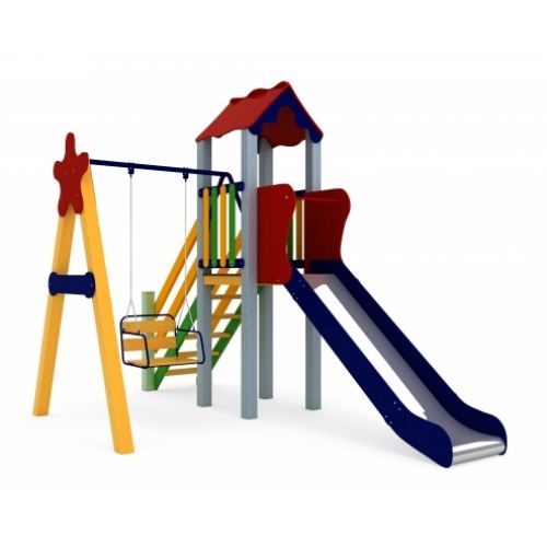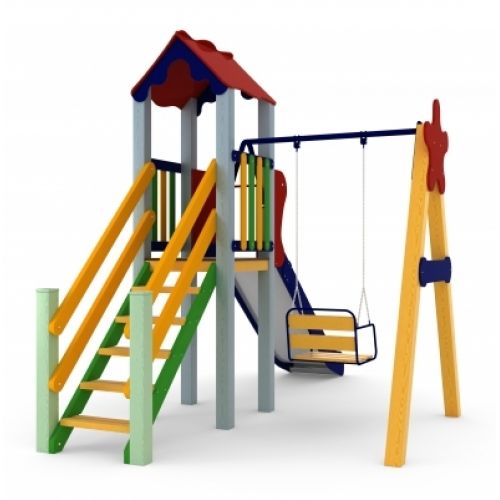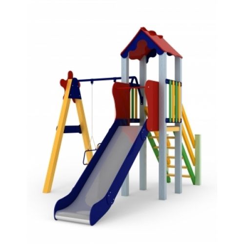 Виріб у вигляді яскравого спортивно-ігрового комплексу. З оригінальним дизайном, вежею, дахом, сходами, гіркою, гойдалкою. Для дітей від 5 років.