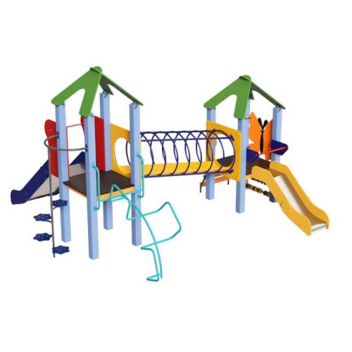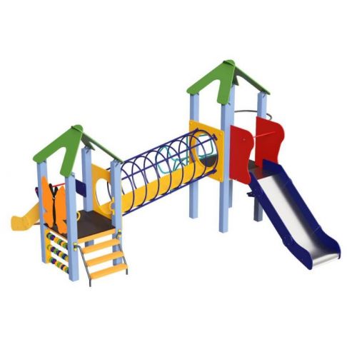 Виріб у вигляді яскравого спортивно-ігрового комплексу. З оригінальним дизайном, 2 гірками, східцями, мостиком, рахівницею, спортивною зоною. Для дітей від 5 років.
