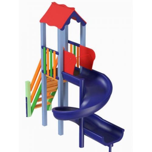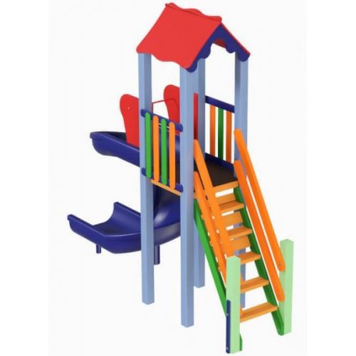Виріб у вигляді яскравого спортивно-ігрового комплексу. З оригінальним дизайном, вежею, дахом, гіркою-спіраль, сходами. Для дітей від 5 років.