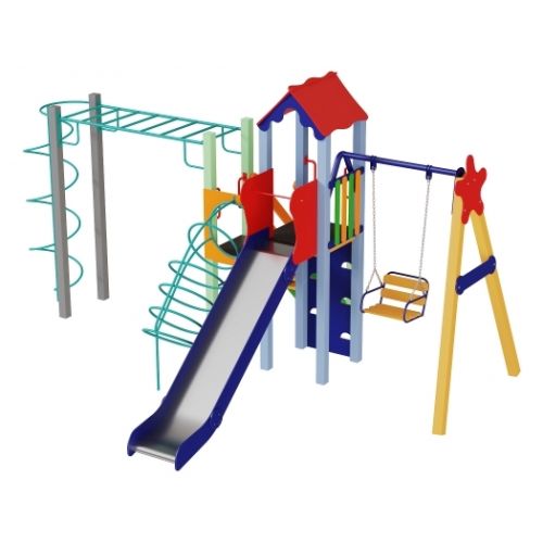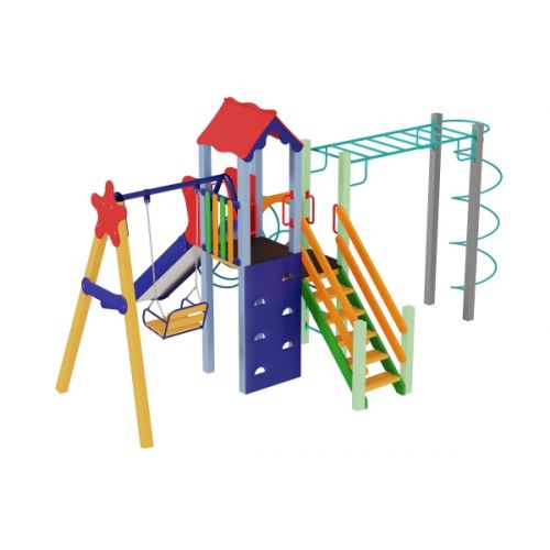 Виріб у вигляді яскравого спортивно-ігрового комплексу. З оригінальним дизайном, вежею, дахом, сходами, гіркою, гойдалкою, рукоходом, лазалкою-тунелем, лазалкою-спіраль. Для дітей від 5 років.