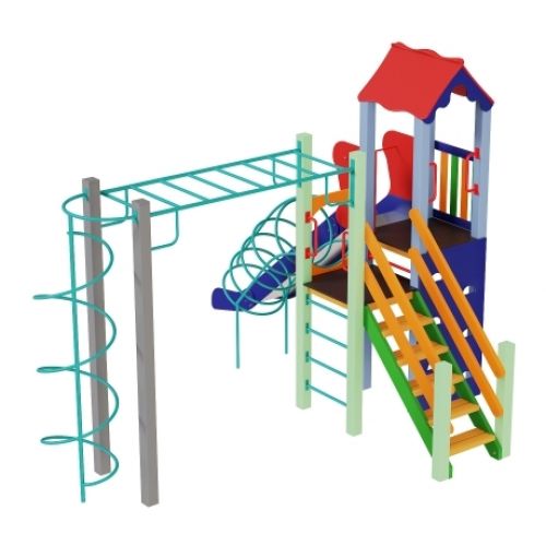 Виріб у вигляді яскравого спортивно-ігрового комплексу. З оригінальним дизайном, дахом, гіркою, сходинками, спортивними елементами. Для дітей від 5 років.