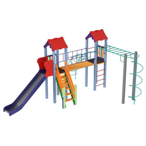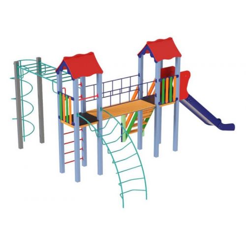 Виріб у вигляді яскравого спортивно-ігрового комплексу. З оригінальним дизайном, 2 вежами, 2 дахами, сходами, гіркою, переходом, мостиком, ліаною, спортивною зоною. Для дітей від 5 років.