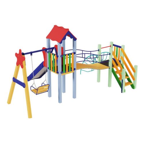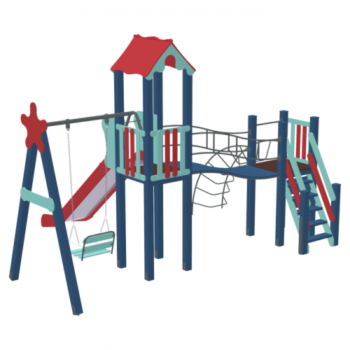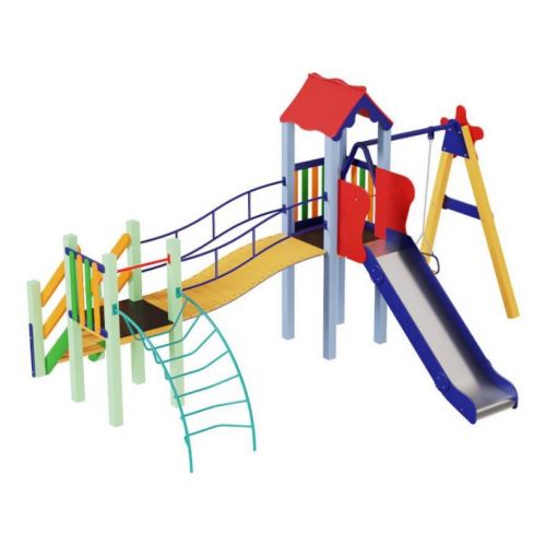 Виріб у вигляді яскравого спортивно-ігрового комплексу. З оригінальним дизайном, вежею, дахом, платформою, лазалкою, мостиком, гіркою, гойдалкою, сходами. Для дітей від 5 років.