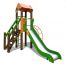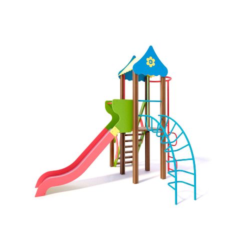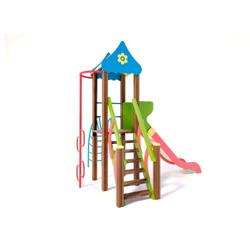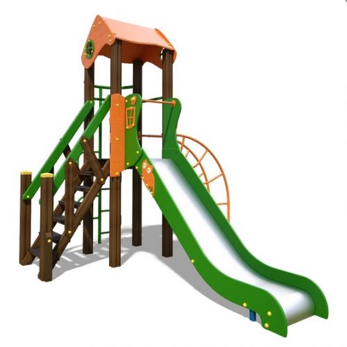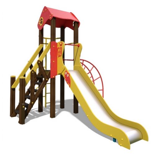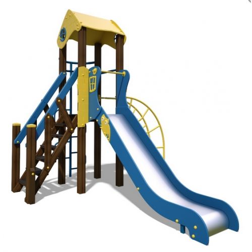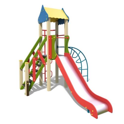 Каркас ігрового комплексу зроблений з металу, а накладки з водостійкої фанери, які покриті фарбою, що стійка до кліматичних змін.