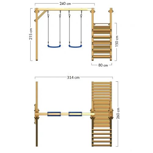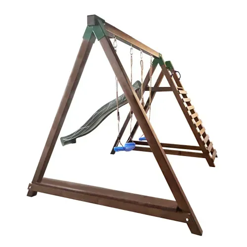 Багатофункціональний майданчик для активних ігор на свіжому повітрі. У комплекті: дві підвісні гойдалки, гірка для спуску, драбинка та лавочка. Каркас виготовлений з масиву сосни, оброблений антисептиком і захисним тонуванням. Гойдалки — з міцного пластику, на регульованих канатах (висота 115–190 см). Максимальне навантаження – 50 кг. Підходить для дітей від 3 років. Колір гойдалок: синій, червоний, жовтий, чорний. Ідеальний варіант для веселого та безпечного дозвілля!