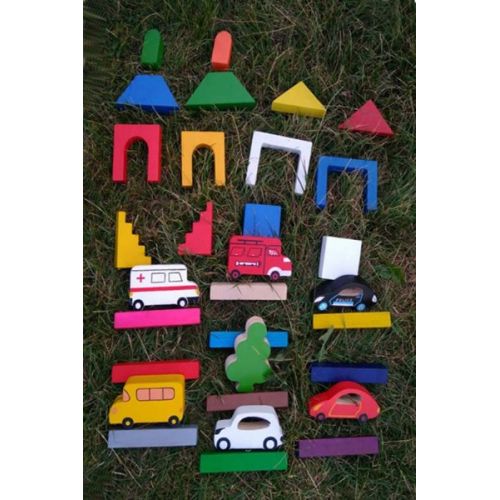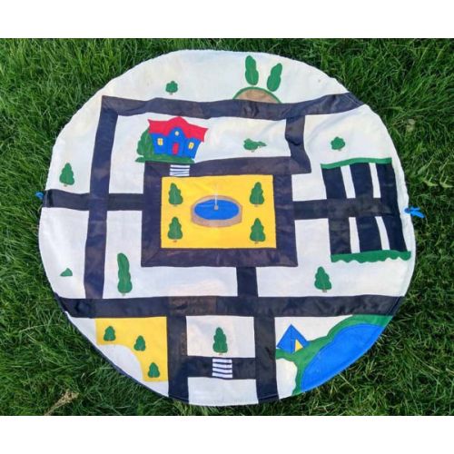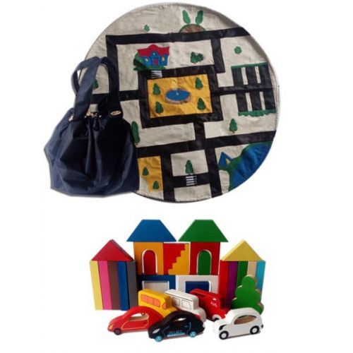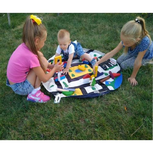 Виріб у вигляді яскравого набору з конструктора, сумки і килимка. Конструктор складається з різнокольорових блоків і 6 машинок для побудови різних конструкцій. Килимок круглої форми з пришитими елементами містечка. Сумку для зберігання легко скласти і розкласти в килимок. Набір підходить для відпочинку і дитячої гри.