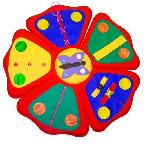Виріб у вигляді яскравого м'якого дидактичного килимка з пелюстками квітки, аплікаціями і різними завданнями. Розмір виробу 90 см.