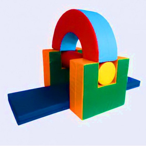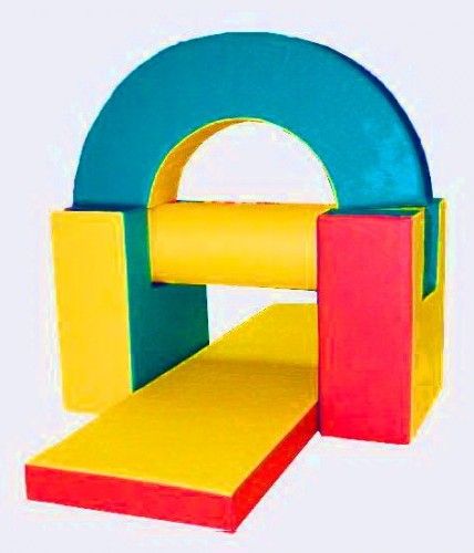 Виріб у вигляді яскравого різнобарвного м'якого тренажера з 5 окремих елементів: опор, циліндра, мату, дуги. Розмір опори 55х25х60 см, циліндра 25х100 см, мату 180х50х10 см, дуги 100 см.