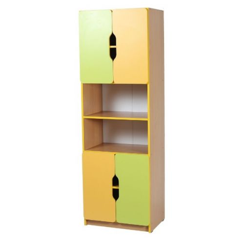 Виріб представлений шафою 4-дверною напівзакритою з ДСП 16 мм. Колір корпусу бук. Колір фасаду жовтий і зелений.