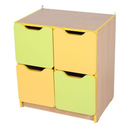 Виріб представлений комодом з 4-ма шухлядами повного висунення з ДСП 16 мм. Колір корпусу бук. Колір фасаду жовтий і зелений.