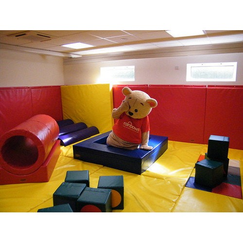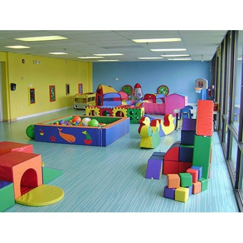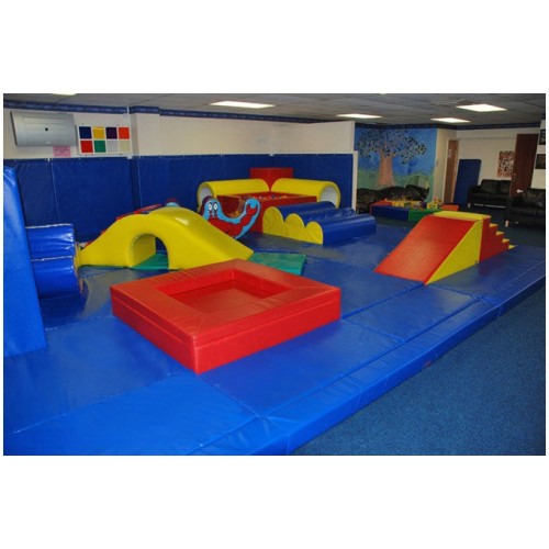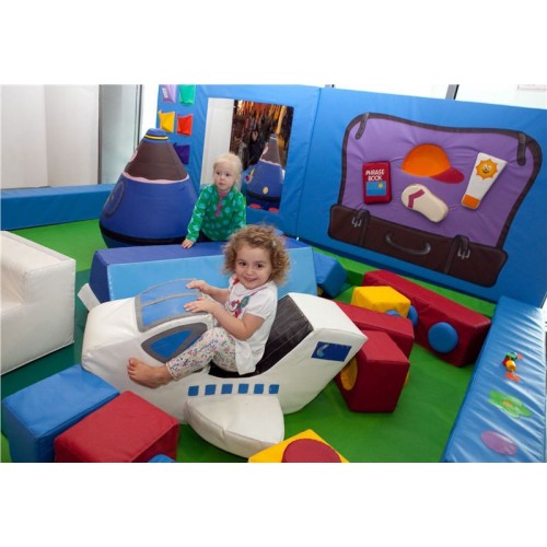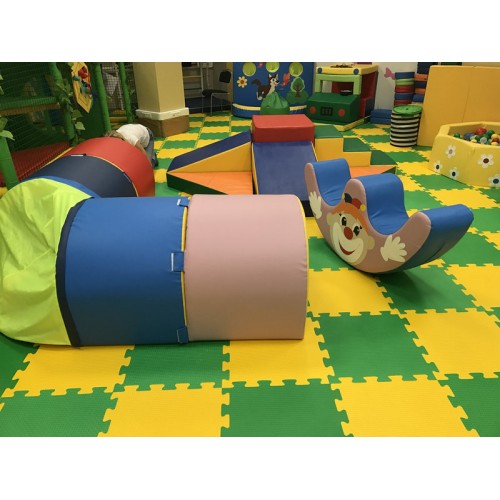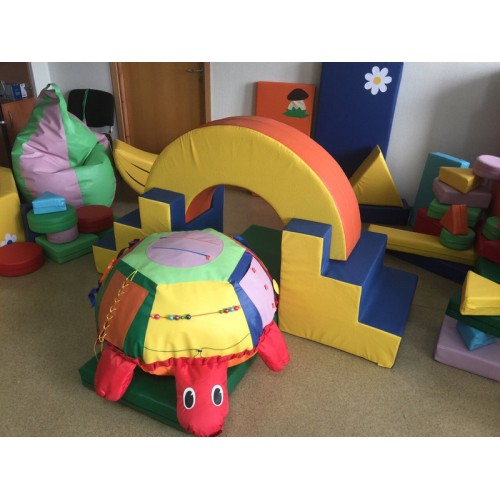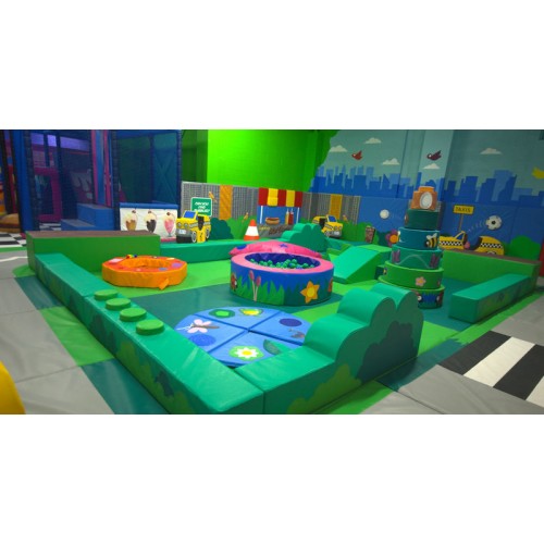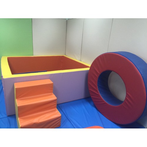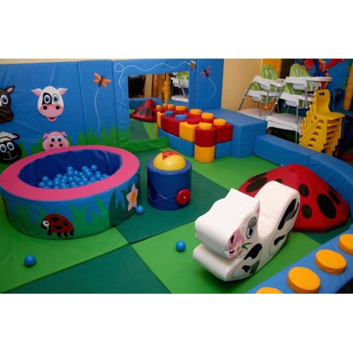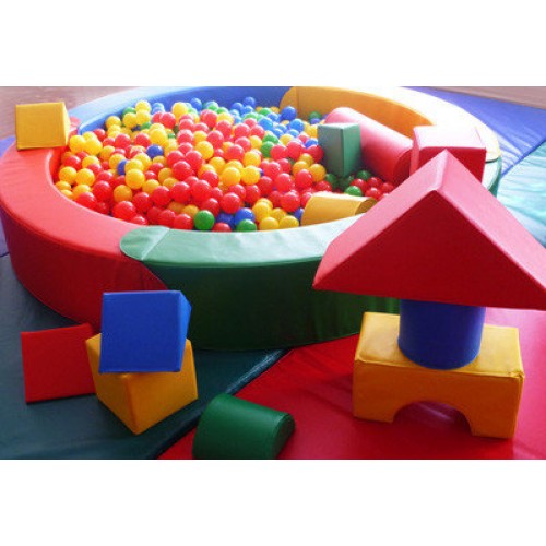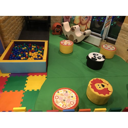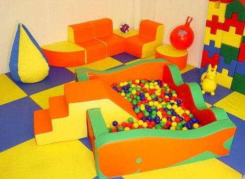 Виріб у вигляді яскравої дитячої ігрової кімнати з елементами, розмірами, кількістю і моделями на вибір. З сухим басейном, ігровими конструкторами, м'якими пуфиками, м'якою підлогою, м'яким парканом. Розмір кімнати до 20 кв.м. Модель яскрава, м'яка і легка.