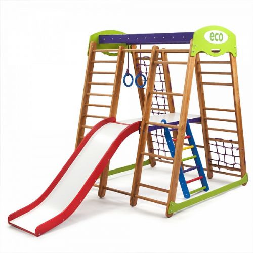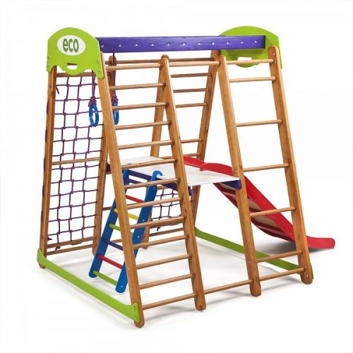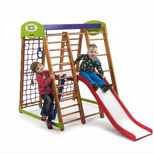 Дитячий спортивний комплекс оснащений усіма ігровими елементами і спортивними атрибутами, необхідними для повноцінного розвитку дитини.