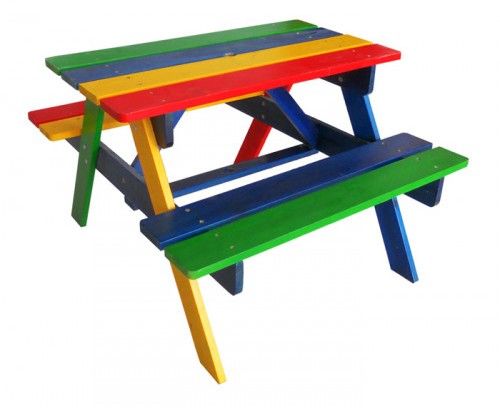 Виріб у вигляді яскравого дитячого столика з 2 зручними лавочками. З отвором в столі для парасолі від сонця.