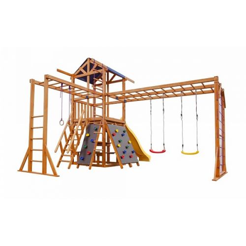 Виріб представлений спортивно-ігровим майданчиком. З гіркою для катання довжиною 3 метри, 2 гойдалками, кільцями, скелелазкою. Всі елементи відшліфовані і безпечні для дітей. Кольори гірки і гойдалок можуть бути різні.