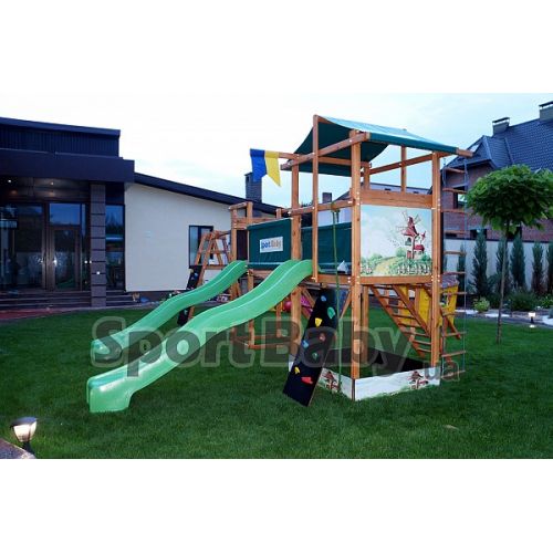 Дитячий майданчик SportBaby-12 - це ідеальне рішення для організації дитячого дозвілля, а також прекрасний тренажер для розвитку спритності, координації і рухливості дитини. При монтажі комплексу враховуються всі вимоги безпеки: гострі елементи конструкції захищені пластиковими глушниками.