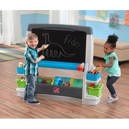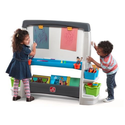 Виріб у вигляді яскравої великої дошки на ніжках. З двосторонньою дошкою: магнітною і крейдовою, 2 кліпсами для паперу, кошиками і кишенями для зберігання приладдя. Підходить для 2 дітей.