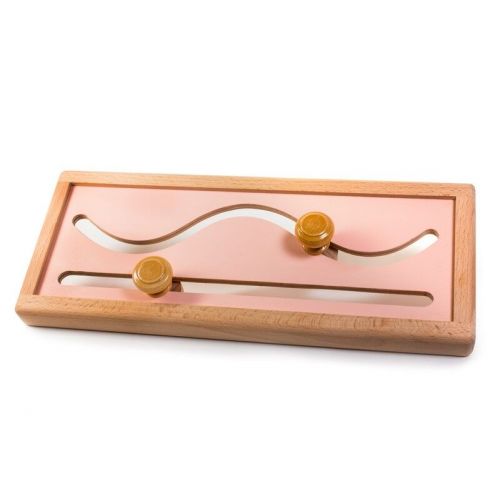 У дерев'яній прямокутній основі знаходиться фанера з прорізом-доріжкою у вигляді 2-х доріжок. З цієї прорізи легко пересувається важіль з невеликою ручкою-кулькою.