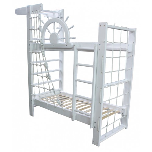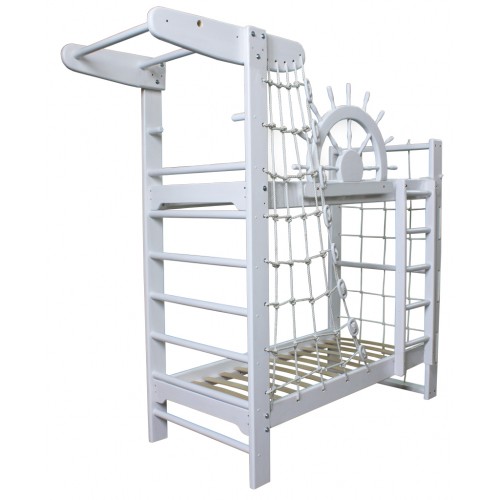 Двоярусне ліжко Пірат Білий з натурального дерева дуже функціональне, це комфортне місце для сну і одночасно повноцінний спортивний куточок, що дозволяє економити простір в кімнаті. Крім цього, двохярусне ліжко зі спортивним куточком може використовуватися дітьми як відмінне місце для ігор.