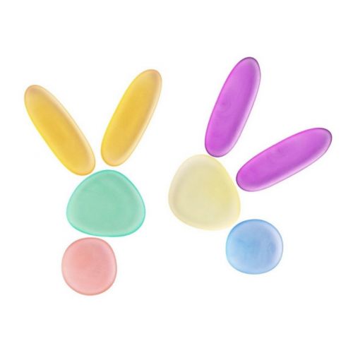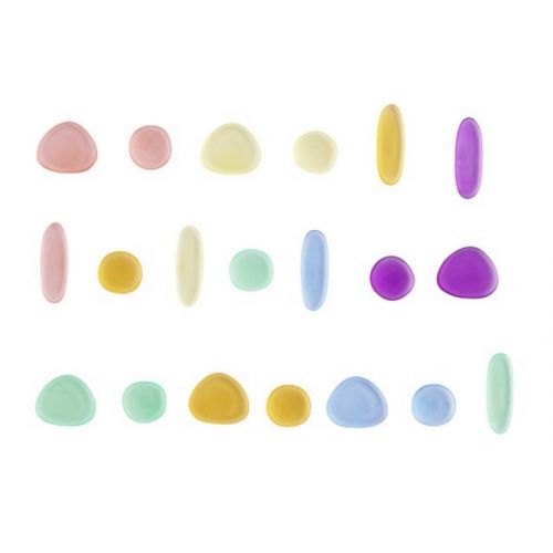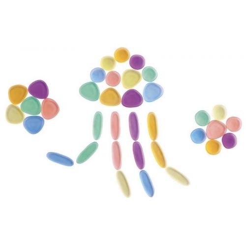 Виріб у вигляді яскравого набору з 36 прозорих камінців різних кольорів і розмірів. З банкою для зберігання. Різнокольорові камінці гладкі, плоскі, приємні на дотик. Можна створювати безліч фігур. Набір розвиває дрібну моторику, уяву, пам'ять, фантазію, сенсорику.