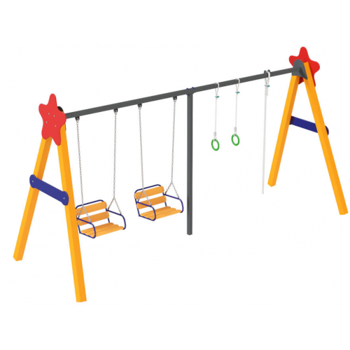 Для розробки гойдалки використовуються високоякісні дерев'яні дошки та металеві елементи. Щоб отримати стійкий насичений колір, компанія-виробник покриває дерево кількома шарами якісної німецької фарби, а метал - елітною глянцевою фарбою іспанського виробництва. Завдяки такому підходу, гойдалка встоїть перед будь-якими погодніми умовами. Перед фарбуванням всі частини грунтуються.