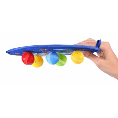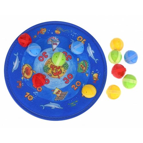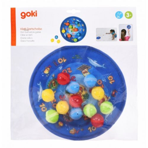 Гра «Метальні м’ячики» – це різновид дартсу. Однак для метання тут не гострі, небезпечні стріли, а легенькі безпечні пластикові кульки. У наборі барвиста мішень і 12 різнокольорових пластикових кульок із ребрами-липучками, завдяки яким кульки кріпляться до мішені. В наборі по 3 кульки блакитного, червоного, жовтого, зеленого кольорів. Діаметр мішені – 25 см. Набір призначений для дітей від трьох років. Всі елементи виготовлені з нешкідливих, нетоксичних матеріалів – пластику і текстилю. Виробник – німецький бренд goki.
