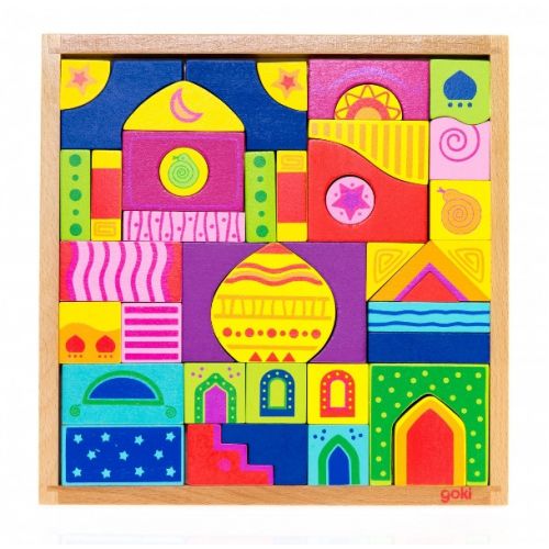 Дерев'яний конструктор німецького виробника іграшок goki складається з 42 деталей з різними малюнками і візерунками в східному стилі. З ним можна грати як з пазлами та збирати малюнки, які задумали дизайнери, а також використовувати як доповнення до інших дерев'яних іграшок. За задумом авторів, можна зібрати палац з казки «1000 і 1 ніч». Грати буде цікаво не тільки дітям, а й дорослим. Вікове обмеження - від трьох років, а використовувана деревина - екологічно чиста.