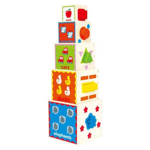 Яскрава забавна Пірамідка складається з 5 кольорових кубиків, які можна складати в пірамідку, щоб вивчити кольору, форми, фрукти, овочі і тварин. Так само в кубиках піраміди передбачені отвори, в яких ховаються геометричні фігури.