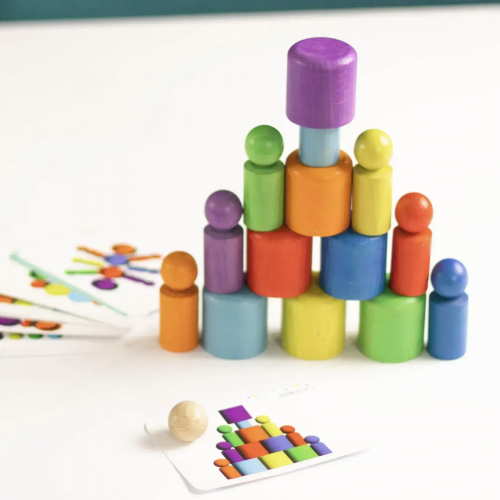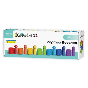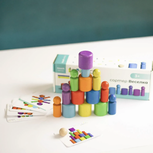 Дерев'яний сортер "Веселка" — це яскравий набір для навчання та гри. У комплекті 7 кольорових стаканчиків, 7 фігурок-чоловічків, кулька та 10 карток із завданнями. Дитина може сортувати елементи за кольорами, будувати балансири, викладати мозаїки, вигадувати сюжетні ігри. Картки підказують ідеї для самостійних занять. Набір розвиває моторику, логіку, увагу, допомагає вивчати кольори, лічбу та прості арифметичні дії. Безпечні матеріали: дерево, фарби на водній основі, картон. Рекомендовано з 3 років. До 3 років — грати без кульки.