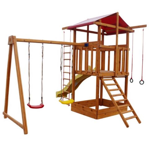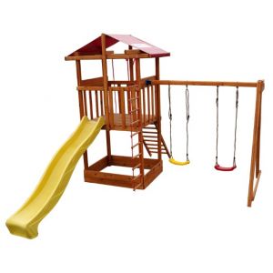 Зроблений з натурального дерева сосни - екологічного, практичного і довговічного матеріалу, що забезпечує максимальний комфорт в процесі експлуатації. Складається з двох'ярусного будиночка зі сходами, гіркою, пісочницею та 2-х. гойдалок.
