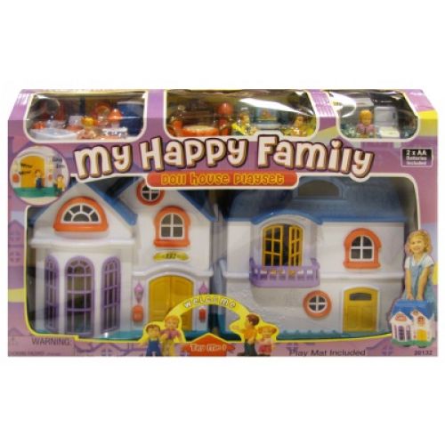 У наборі: будинок зі звуковими і світловими ефектами (2 батареї АА - в комплекті.), Тато, мама, син, дочка, собака, ліжко, тумбочка для спальні, столик з дзеркалом, камін, торшер, вітальня з ТВ, журнальним столиком і кріслами, ванна, туалет, умивальник, обідній стіл.