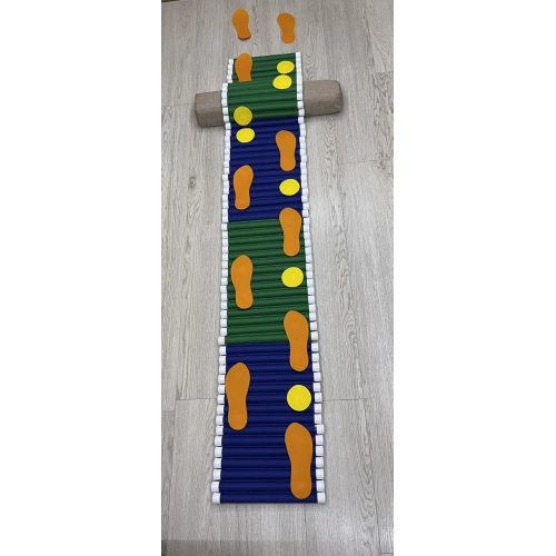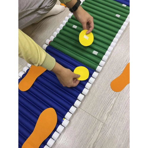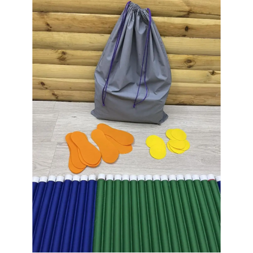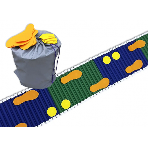 Набір "Килимок для тренування м'язових тканин стопи" призначений для комплексного розвитку дитини та профілактики плоскостопості. Розмір килимка - 36 см шириною та 190 см довжиною. Використовується у різних середовищах, таких як дитячі садки, розважальні центри, сенсорні кімнати та вдома. Килимок забезпечує масаж стопи, сприяє зміцненню гомілковаго суглоба та запобігає появі плоскостопості. Він також сприяє розвитку м'язів ніг, рук і спини дитини, формує правильну поставу та розвиває увагу та самоконтроль. Набір включає в себе килимок з м'якими кріпленнями для додаткових елементів, таких як кружечки та слідочки. Чохол для зберігання забезпечує захист від бруду, вологи та ультрафіолету. Зручний для збирання та економії місця. Набір виготовлено з якісних та безпечних матеріалів відповідно до вимог Наказу МОН № 873 від 21.06.2019 р. та Наказу МОН № 414 від 24.03.2018 р.