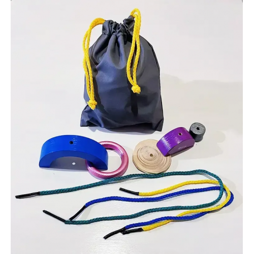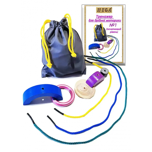 Комплектація: мішечок з ручками -затяжками (14х11 см), дерев’яни елементи (найменший елемент не менш 2см.) у кількості 5 шт., шнурки різного кольору та різної довжини у кількості 3 шт., методична інструкція з описом програми і вправами.